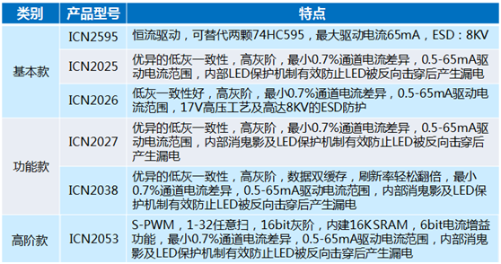 集創還先后推出了ICN2025、ICN2027、ICN2038、ICN2012、ICN2053等新產品,形成了高、中、低端全面覆蓋的LED顯示產品組合。其中ICN2053是小間距LED顯示屏恒流驅動器的首選,它專為1/32掃以內掃描屏設計的內建SPWM及16K SRAM恒流驅動器,具有高精度寬范圍電流輸出,14Bit PWM灰階控制,內建鬼影消除電路、LED保護電路及6位電流增益功能。